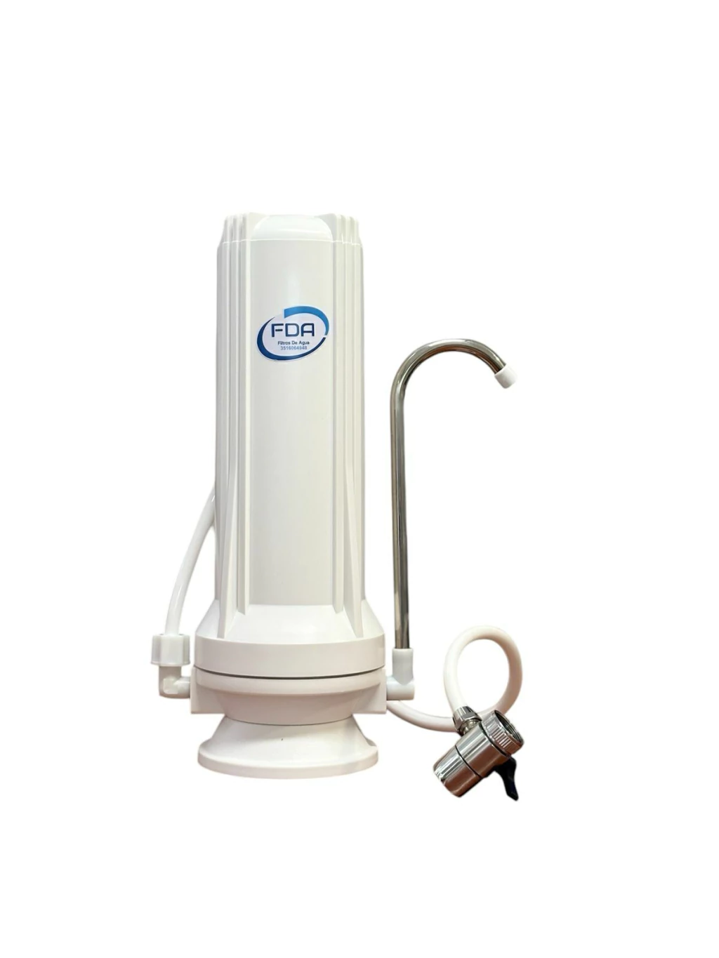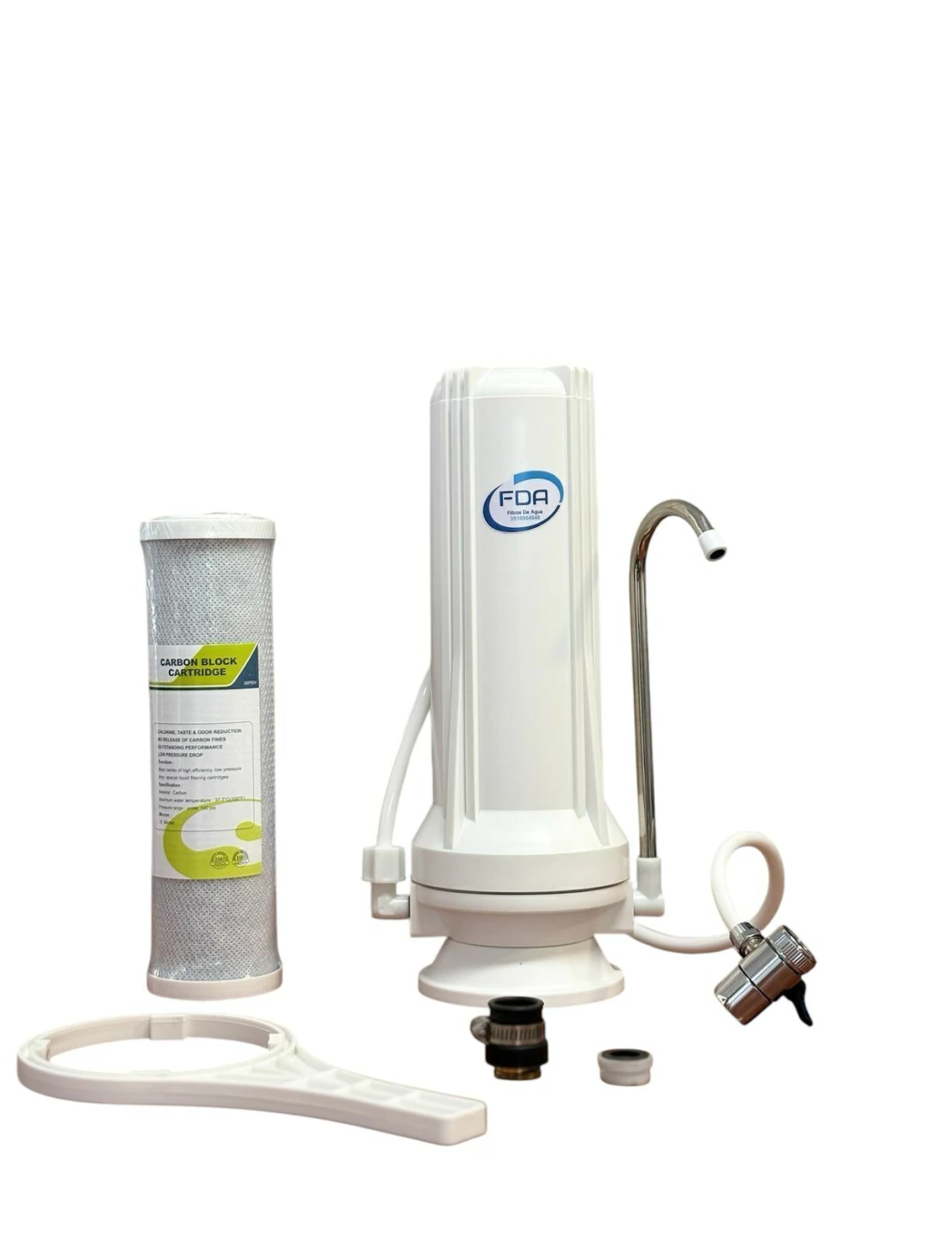 Transforma la calidad de tu agua con nuestro Purificador Sobre Mesada, diseñado para ofrecerte la máxima pureza en cada gota. Este innovador purificador cuenta con un filtro de carbón activado en bloque, eficaz en la retención de sedimentos, materia orgánica, pesticidas, cloro, así como en la eliminación de malos olores y sabores del agua.
